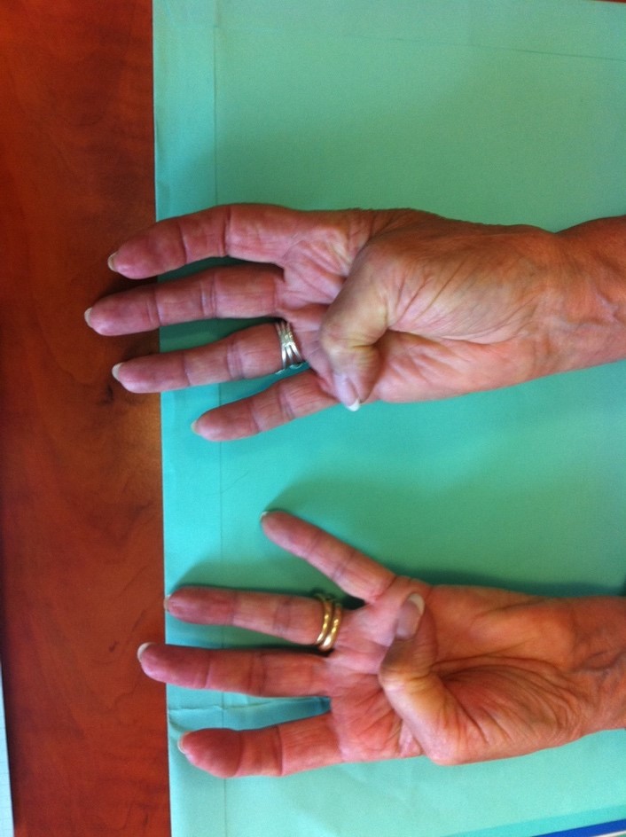 Dans l’évolution apparait une déformation du pouce, avec rétraction de la première commissure (espace entre le pouce et l’index).